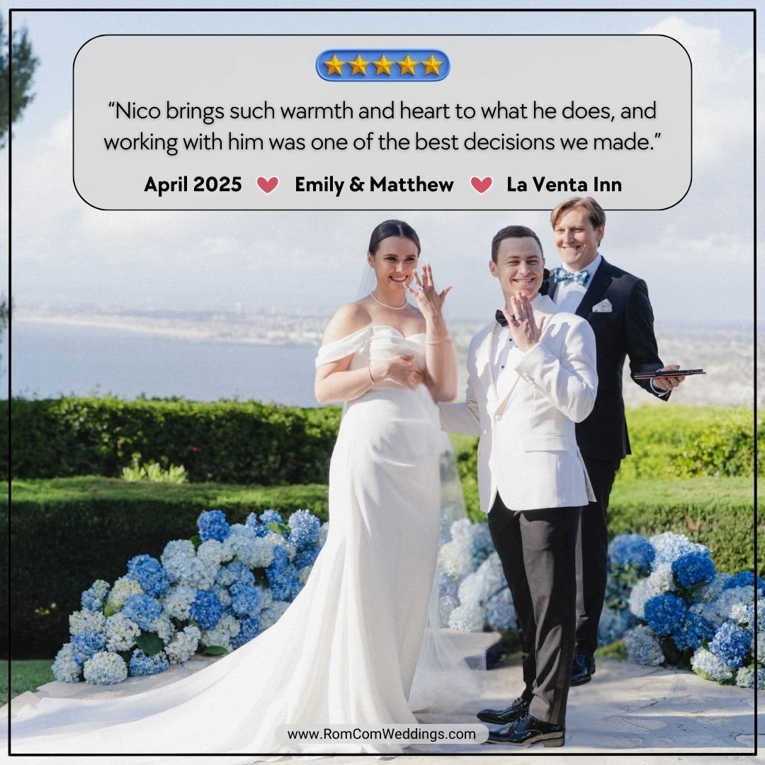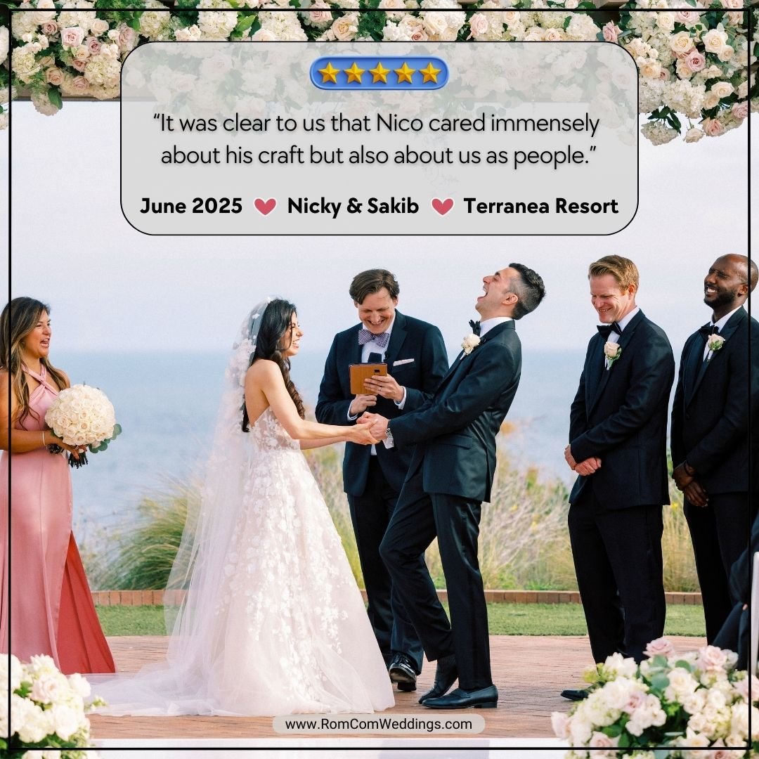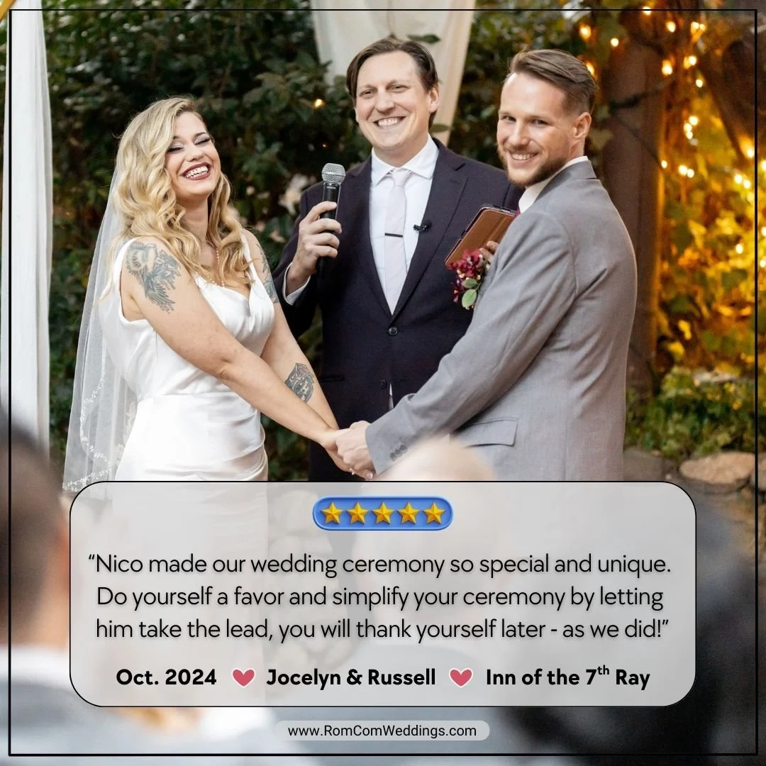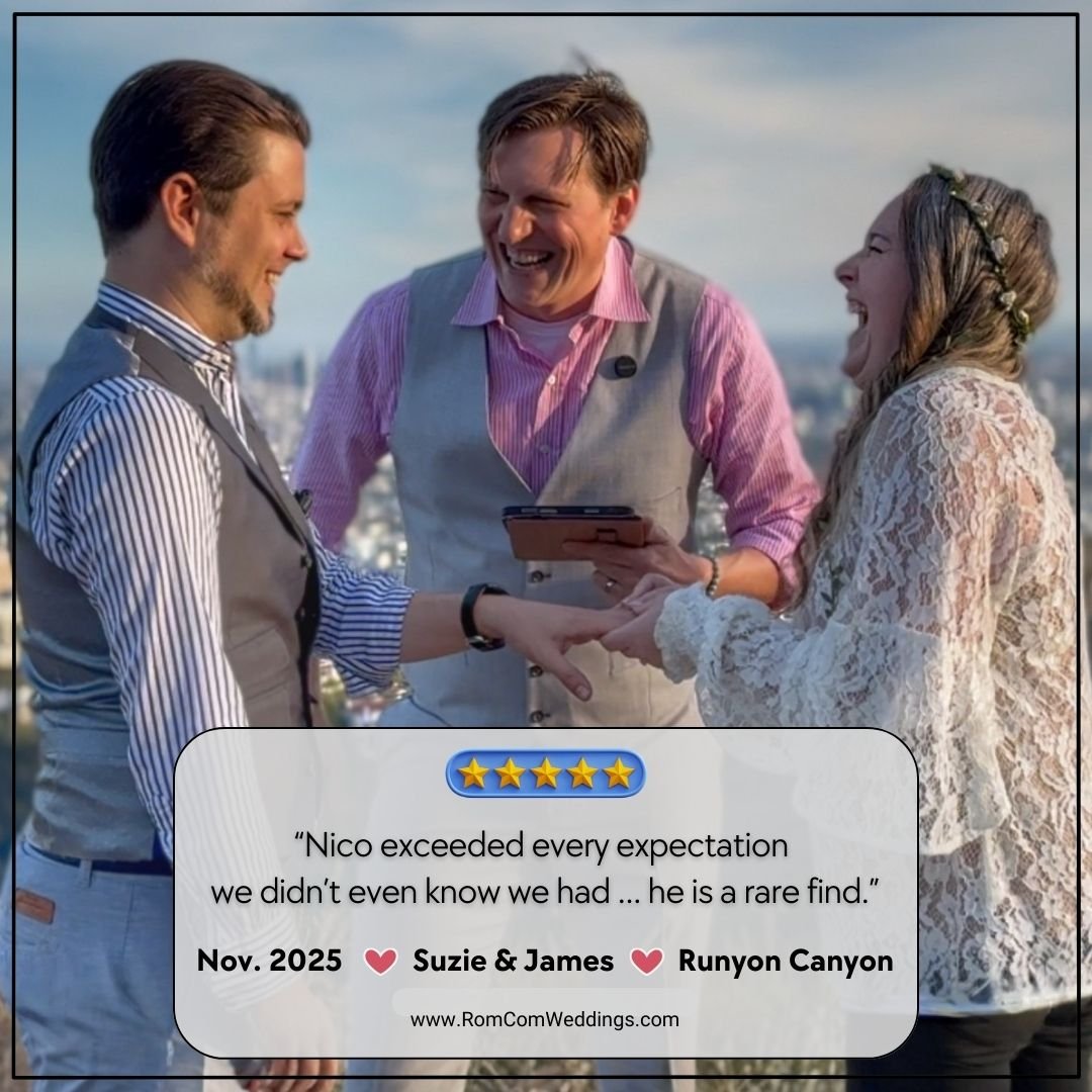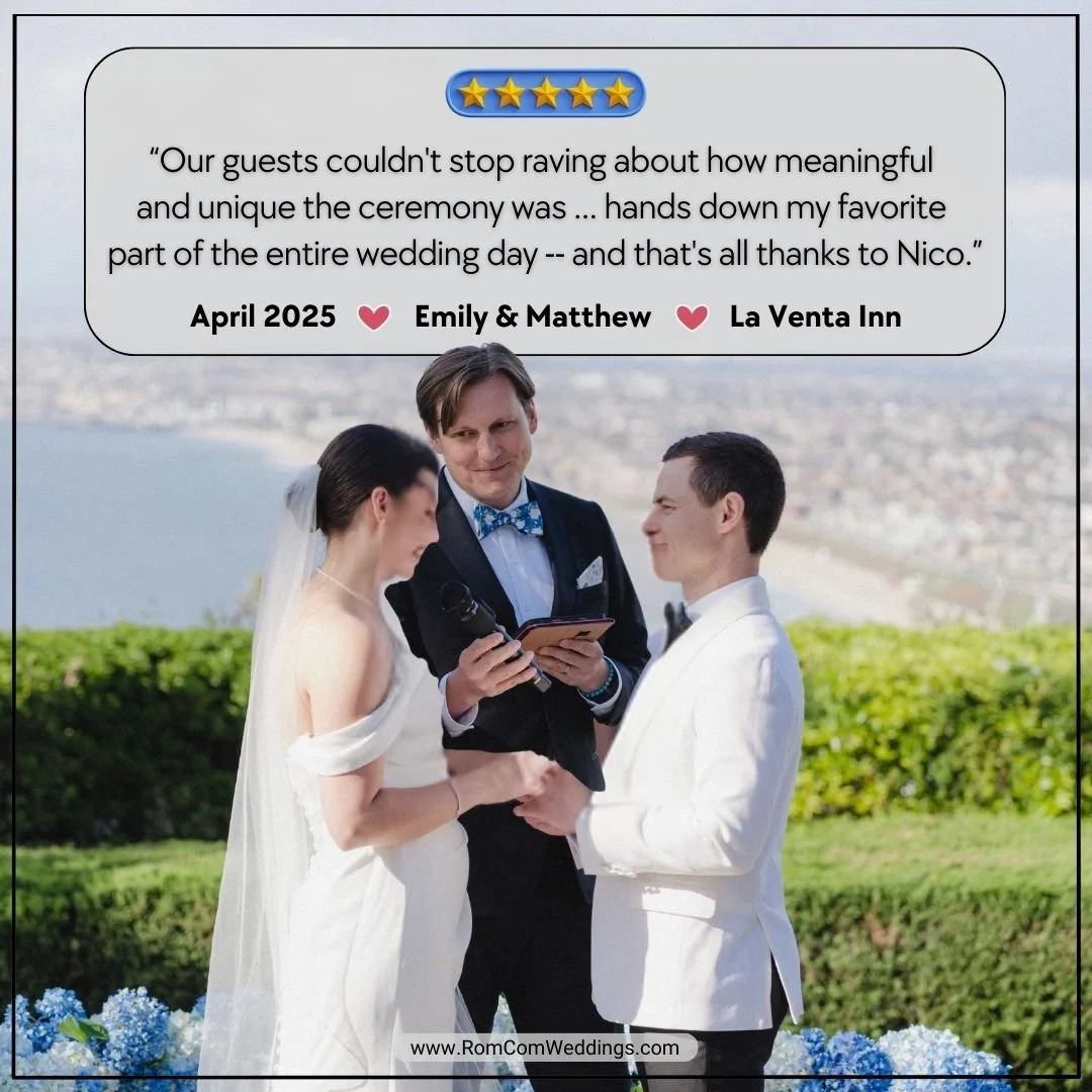 Nico Raineau is a professional officiant who uses his years of experience as a Hollywood screenwriter to personalize your marriage ceremony and elevate your wedding into a cinematic experience, with all the charming and funny feels of a romantic comedy.